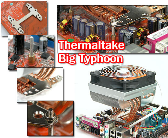 Ÿ¿öÇü µðÀÚÀÎÀÇ Thermaltake Big TyphoonÀº ´ÙÁöÀΰú ¹«°Ô ¶§¹®¿¡ º¹ÀâÇÑ ¼³Ä¡ ¹æ¹ýÀ» »ç¿ëÇÑ´Ù. ¿ª»ï°¢ÇüÀÇ Äð·¯ ÀÚü´Â ¸ÞÀκ¸µå ¼ÒÄÏ ÁÖº¯ÀÇ ºÎǰ¿¡ ¿µÇâÀ» ¹ÞÁö ¾ÊÁö¸¸, À̸¦ °íÁ¤Çϱâ À§ÇÑ ¼³Ä¡ ºÎǰµéÀÇ °æ¿ì´Â ±×·¸Áö ¸øÇÏ´Ù. ¿¡¾î°¡À̵尡 ´Þ¸° ÄÉÀ̽º¿¡¼­´Â ±×´ë·Î »ç¿ëÇÒ ¼ö ¾ø´Ù.
