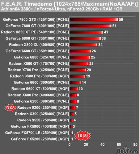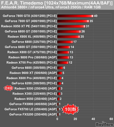 1024x768 ÇØ»óµµ¿¡¼­ ¾ÈƼ¾Ë¸®¾Æ½Ì(AA)°ú ºñµî¹æ¼º ÇÊÅ͸µ(AF)¸¦ »ç¿ëÇÏÁö ¾ÊÀº Ç®¿É¼Ç »óÅ·Π¸¸µé¾î Å×½ºÆ®ÇÑ °á°ú´Â GeForce 7800 GTX°¡ 59ÇÁ·¹ÀÓÀ¸·Î Ç϶ôÇßÀ¸¸ç, 7800 GT´Â 51ÇÁ·¹ÀÓÀÌ ³ª¿Ô´Ù. È­ÁúÀÌ ¿Ã¶ó°¡¸é¼­ Æò±Õ 20ÇÁ·¹ÀÓ ÀÌÇϰ¡ Radeon X800 GTºÎÅÍ Çü¼ºµÇ°í ÀÖ´Ù. ¶ÇÇÑ 1 ÇÁ·¹ÀÓ ÀÌÇÏÀÇ Á¦Ç°¿¡ GeForce FX5700 LE±îÁö À̸§À» ¿Ã¸®°Ô µÇ¾ú´Ù.