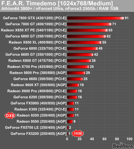 Medium¿É¼Ç Å×½ºÆ®¿¡¼­µµ ³ªÅ¸³­ °ÍÀÌÁö¸¸ ƯÀÌÇÏ°Ô Radeon 9200ÀÇ °á°ú°¡ Radeon X300À̳ª 9550º¸´Ùµµ ³ôÀº °ÍÀ¸·Î ³ªÅ¸³µ´Âµ¥, ÀÌ´Â Radeon 9200ÀÌ À̸§Àº 9000 ½Ã¸®Áî¶óµµ ½ÇÁ¦·Î´Â DirectX 9.x¸¦ Áö¿øÇÏÁö ¸øÇÏ´Â DirectX 8.1 ¼¼´ëÀ̱⠶§¹®¿¡ DirectX 8 ¼¼ÀÌ´õ°¡ °­Á¦ Àû¿ëµÇ¸é¼­ ÇÁ·¹ÀÓÀÌ ¿Ã¶ó°£ °ÍÀÌ´Ù.