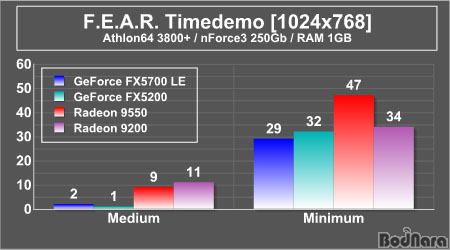 °¡Àå ³·Àº °á°ú¸¦ º¸¿©ÁØ GeForce FX5200ÀÇ °æ¿ì¿¡´Â Æò±Õ 1ÇÁ·¹ÀÓÀ̶ó´Â °á°ú°¡ ³ª¿Ô´Ù. ÇÏÁö¸¸ À̰ÍÀº Æò±ÕÀûÀ¸·Î 1ÇÁ·¹ÀÓÀ» ±â·ÏÇÑ´Ù´Â Àǹ̰¡ ¾Æ´Ï¶ó °ÔÀÓ¿¡¼­ º¸¿©ÁÙ ¼ö ÀÖ´Â °¡Àå ³·Àº ¼öÄ¡°¡ 1À̱⠶§¹®¿¡ ÀÌ·¸°Ô ³ªÅ¸³­ °ÍÀ¸·Î, ½ÇÁ¦·Î´Â 1ÇÁ·¹ÀÓ ÀÌÇÏÀÇ ¼öÁØÀ» º¸¿©ÁÖ°í ÀÖ´Ù.