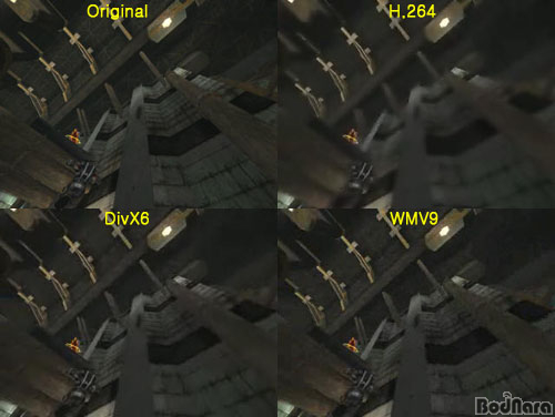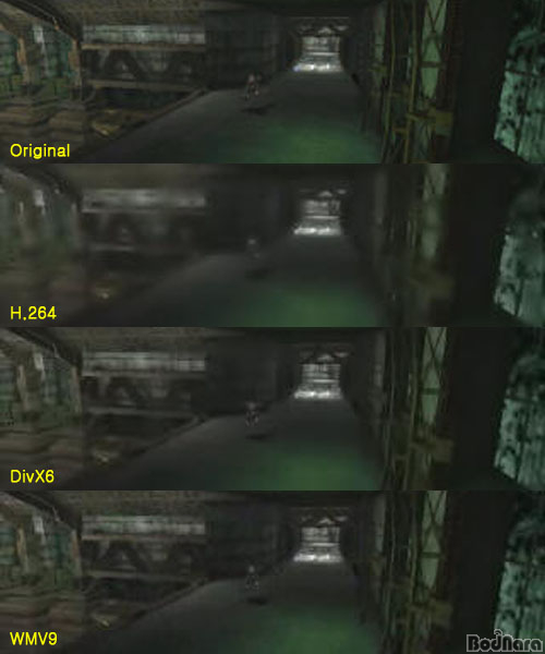 ÀúÇØ»óµµ·Î ÀÎÄÚµùµÈ °á°ú¹°À» ºñ±³Çغ» °á°ú DivX6°¡ °¡Àå ¿ì¼öÇß°í, H.264´Â À̹ø¿¡µµ ¿ª½Ã ´Ù¼Ò È帰 ¸ð½ÀÀÌ´Ù. WMV9Àº Ç×»ó »ý±â´Â ±ïµÎ±â°¡ ¿©ÀüÈ÷ ½É°¢ÇÑ ¼öÁØÀ̾ú´Ù. H.264°¡ ¾ÈƼ¾Ë¸®¾Æ½ÌÀ» Àû¿ë½ÃŲµíÇÑ ¿Ü°¢¼±À» Ç¥ÇöÇØÁشٸé, DivX6´Â ºñµî¹æ¼º ÇÊÅ͸µÀ» Àû¿ëÇѵíÇÑ º®¸éÀ» Ç¥ÇöÇØ ÁÖ°í ÀÖ´Ù.