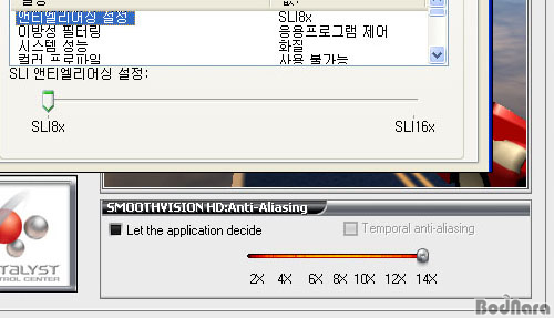 AA(Anti Aliasing)Àº ½Ì±Û ±×·¡ÇÈ Ä«µåÀÏ ¶§ ATI´Â 6X, nVIDIA´Â 8X±îÁö¸¸ Áö¿øÇÏÁö¸¸, ¸ÖƼ ·»´õ¸µ ¸ðµå¸¦ ¸¸µé¸é ATI´Â 14X, nVIDIA´Â 16X±îÁö ¼³Á¤ÀÌ °¡´ÉÇÏ´Ù. ATI Cross Fire´Â Catalyst Control Center¿¡¼ 2X ~ 14X±îÁö ´Ü°èº°·Î Á¶ÀýÇÒ ¼ö Àִµ¥, nVIDIA´Â SLI¸¦ ±¸¼ºÇصµ AA ¿É¼ÇÀº ½Ì±Û ±×·¡ÇÈ Ä«µåÀÏ ¶§¿Í °°ÀÌ 2X~8XQ±îÁö¸¸ ³ªÅ¸³´Ù. SLI 8X¿Í 16X¸¦ ¼³Á¤Çϱâ À§Çؼ´Â SLI ·»´õ¸µ ¸ðµå ¿É¼ÇÀ» SLI ¾ØÆ¼ ¾Ù¸®¾î½ÌÀ¸·Î ¹Ù²ãÁà¾ß ÇÑ´Ù.
