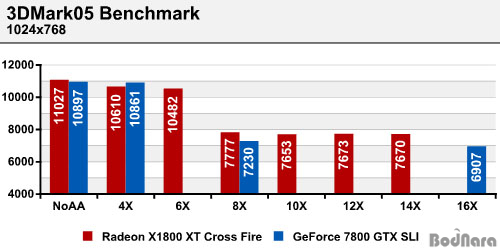3DMark¿¡¼ AAº° ¼º´É º¯È¸¦ ºñ±³Çغ¸¸é ¸ÖƼ ·»´õ¸µÀ» ±¸¼ºÇؼ 4X AA±îÁö´Â AA¸¦ Àû¿ëÇÏÁö ¾ÊÀº °Í°ú ¼º´É Â÷À̰¡ º°·Î ¾ø´Ù. ATIÀÇ 6X´Â AA 4X¿¡ Super SampleÀ» ±¸ÇöÇÑ °ÍÀ̱⠶§¹®¿¡ °á°ú°ª¿¡ Â÷À̰¡ º¸ÀÌÁö ¾Ê´Â´Ù. ÀÌ´Â 10X, 12X, 14X·Î µé¾î°¡´Â ¼¼ºÎ µî±Þ¿¡¼µµ ºñ½ÁÇÏ°Ô ³ªÅ¸³ª¸ç ½ÇÁ¦·Î ¼º´É Â÷À̰¡ Å©°Ô ³ªÅ¸³ª´Â °æ°èÁ¡Àº 8X AA¿¡¼´Ù. nVIDIAÀÇ SLI AA ¿ª½Ã 8X¿Í 16XÀÇ Â÷ÀÌ´Â Å©°Ô ³ªÁö ¾Ê´Â´Ù.