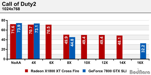 º¥Ä¡¸¶Å© ÇÁ·Î±×·¥ ¿Ü¿¡ ½ÇÁ¦ °ÔÀÓÀÎ Call of Duty2¿¡¼ÀÇ AA¿¡ µû¸¥ ÇÁ·¹ÀÓ º¯È¸¦ ºñ±³Çصµ 3DMark05¿Í ¸¶Âù°¡Áö·Î 8X¸¦ ±âÁØÀ¸·Î Å«ÆøÀÇ Ç϶ôÀ» º¸ÀÏ »Ó ³ª¸ÓÁö ¼¼ºÎ AA ¼³Á¤¿¡¼´Â °á°ú¿¡ Â÷À̸¦ º¸ÀÌÁö ¾Ê´Â´Ù.