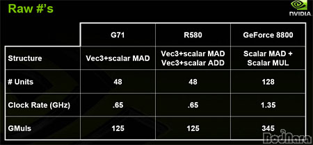 nVIDIAÀÇ ÁÖÀå´ë·Î¶ó¸é G80¿¡ ÀåÂøµÈ Shader ÄÚ¾î´Â Scalar MAD + Scalar MUL ¿¬»êÀÌ °¡´ÉÇϸç GMul ¿¬»ê±âÁØÀ¸·Î ±âÁ¸ G71ÄÚ¾îÀÇ Shader ¿¬»ê ¼º´ÉÀ̳ª °æÀï»çÀÇ R580 ±×·¡ÇÈ ÄÚ¾îÀÇ Shader ¿¬»ê ¼º´Éº¸´Ù 3¹è¿¡ °¡±î¿î Shader ¿¬»ê ¼º´ÉÀ» º¸¿©ÁÙ¼ö ÀÖ´Ù.