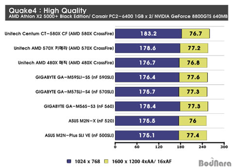 183.2fps·Î °¡Àå ³ôÀº ÇÁ·¹ÀÓÀ» º¸¿´´Ù. °¡Àå ³·Àº ¼º´ÉÀº ¸Þ¸ð¸® ´ë¿ªÆøÀÌ ³·¾Ò´ø nForce 500SLI Ĩ¼ÂÀ»