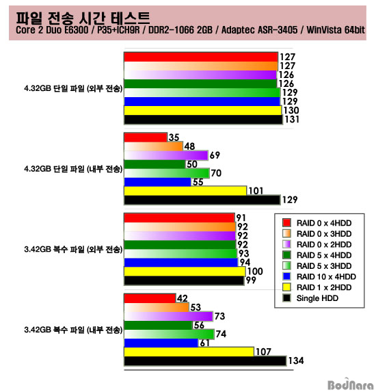 µ¥ÀÌÅ͸¦ º¹»çÇÒ ¶§´Â ¸ðµÎ ½Ì±Û ÇÏµå ¼º´É¿¡ Á¦¾àÀ» ¹Þ¾Æ ½Ã°£ÀÌ ¶È°°¾Ò´Ù. ±×·¯³ª ³»ºÎ Àü¼Û Å×½ºÆ® °á°ú¸¦ ºñ±³ÇÏ¸é °¢ RAID ±¸¼º °£ÀÇ ¼º´É