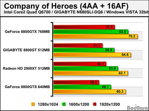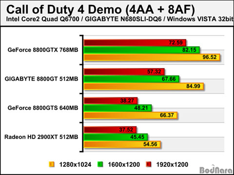 ÄÝ ¿Àºê µàƼ4 : ¸ð´ø ¿öÆä¾î µ¥¸ð¸¦ Fraps¸¦ ÀÌ¿ëÇØ Æò±Õ ÇÁ·¹ÀÓÀ» ÃøÁ¤ÇÑ °á°ú ÇØ»óµµ ¹× ÇÊÅÍ Àû¿ë¿¡ µû¶ó ¾à°£ÀÇ Â÷ÀÌ´Â ÀÖÁö¸¸ GeForce 8800GTXÀÇ 85~90%¿¡ ÁØÇÏ´Â ¼º´ÉÀ» Á¦°øÇϰí ÀÖÀ¸¸ç GeForce 8800GTS 640MBº¸´Ùµµ 20~25% °¡·® ¾Õ¼± ¼º´ÉÀ» º¸¿©ÁÖ°í ÀÖ´Ù. Ãâ½Ã °¡°ÝÀ» °í·ÁÇÑ´Ù¸é ±â°¡¹ÙÀÌÆ® GeForce 8800GÀÇ °¡°Ý´ë ¼º´Éºñ´Â GeForce 8800½Ã¸®ÁîÁß ÃÖ°í¶ó°í ÇÒ ¼ö ÀÖ´Ù.