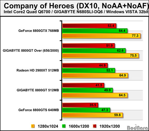 ¸¶Áö¸·À¸·Î DirectX10 ±â¹ÝÀÇ °ÔÀÓÀÎ C.O.H¸¦ ÅëÇÑ ÇÁ·¹ÀÓ ÃøÁ¤À» ÇØº¸µµ·Ï ÇÏÀÚ. C.O.HÀÇ °æ¿ì HD 2900XT°¡ °­¼¼¸¦ º¸À̰í ÀÖ´Â °¡¿îµ¥, ±â°¡¹ÙÀÌÆ® 8800GT´Â À̺¸´Ù ¾à°£ ³·Àº ¼º´ÉÀ» º¸¿©ÁÖ°í ÀÖ´Ù.