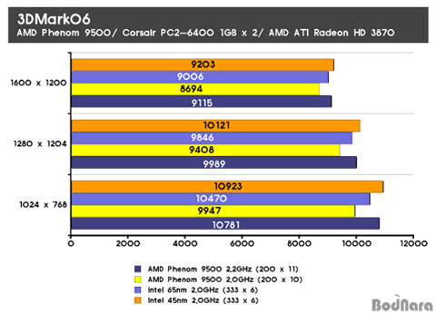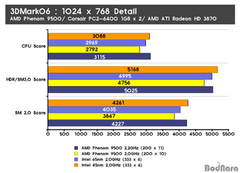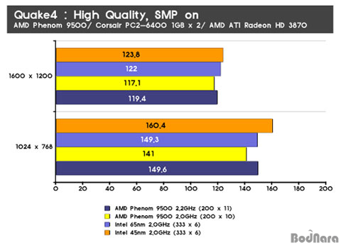 Å×½ºÆ® °á°ú À̹ø¿¡µµ °°Àº 2GHzÀÇ Å¬·°¿¡¼­ CPUÀÇ ¿µÇâÀ» ¸¹ÀÌ ¹Þ°í ÀÖ´Â ÀúÇØ»óµµÀÎ 1024 x 768¿¡¼­ 65nm QX6850 2GHz¿Í ºñ±³ÇÏ¿© ¾à 15.95%, 45nm QX9650 2GHz¿¡¼­´Â ¾à 21.43% ³·Àº ¼º´ÉÀ» º¸¿©ÁÖ°í ÀÖ´Ù. Phenom 9500ÀÇ º» Ŭ·°ÀÎ 2.2GHz¿¡¼­ ¿ª½Ã °æÀï CPUµéº¸´Ù ¶³¾îÁö´Â ¼º´ÉÀÌ ³ªÅ¸³ª°í ÀÖ´Ù. ¾Õ¼­µµ ¾ð±ÞÇßµíÀÌ ¸ÞÀκ¸µå Æ©´× ¹× ±×·¡ÇÈ µå¶óÀ̹ö µîÀÇ °³¼±À¸·Î ÀÌ·± ºÎºÐµéÀº Á» ´õ Çâ»óµÉ °ÍÀ¸·Î ¿¹»óµÈ´Ù.