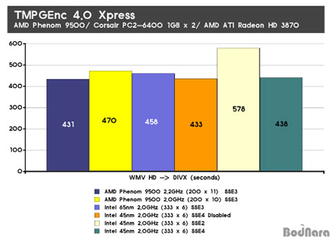 À̹ø¿¡´Â µà¾ó ¹× Äõµå ÄÚ¾î Áö¿øÀ» ºñ·ÔÇÏ¿© SSE4 ¸í·É¾î±îÁö Áö¿øÇÏ´Â ÀÎÄÚµù ÇÁ·Î±×·¥ÀÎ TMPGEnc 4.0 Xpress (4.4.0.234) ÃֽŠƮ¶óÀ̾ó ¹öÀüÀ» »ç¿ëÇÏ¿© ÀÎÄÚµù ½Ã°£À» ºñ±³ÇÏ¿© º¸¾Ò´Ù. DIVX º¯È¯ °úÁ¤¿¡ DIVX ÄÚµ¦ ¿É¼ÇÀÇ SSE4 ¸í·É¾î ºÎºÐÀº 45nm QX9650À» Á¦¿ÜÇϰí 65nm QX6850°ú AMD PhenomÀº ¼±ÅÃÇÒ ¼ö ¾ø´Ù. AMD Phenom ¿ª½Ã SSE4A ¸í·É¾î¸¦ Áö¿øÇÏÁö¸¸, ÀÎÅÚ°ú´Â ´Ù¸¥ ¸í·É¾îÀ̱⠶§¹®¿¡ ÀÎÄÚµù¿¡¼­ÀÇ Çâ»óÀ» ±â´ëÇϱâ´Â ¾î·Æ´Ù.