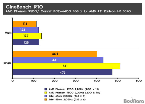 ½Ì±Û Äھ Å×½ºÆ®ÇÒ °æ¿ì µ¿ÀÏ Å¬·°¿¡¼­ ÀÎÅÚÀÇ µÎ CPU°¡ AMD Phenomº¸´Ù ´õ ºü¸¥ ½Ã°£ ³»¿¡ ·»´õ¸µÀ» ³¡¸¶Ä¡°í ÀÖ´Â °ÍÀ¸·Î È®ÀεǸç, ¸ÖƼ ÄÚ¾î »ç¿ë½Ã¿¡´Â ½Ì±Û¿¡¼­º¸´Ù ½Ã°£ÀÌ °ÅÀÇ 4¹è °¡±õ°Ô Àý¾àÇÒ ¼ö °Íµµ È®ÀÎÇÒ ¼ö ÀÖ´Ù. ¸ÖƼ Äھ¼­´Â Phenom 9500ÀÇ ±âº» Ŭ·°ÀÎ 2.2GHz¿¡¼­´Â 65nm QX6850 2GHz¿¡ Á¢±ÙÇϰí ÀÖ´Ù.