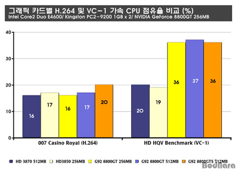 G92 8800GT 256MB´Â G92 8800GT 512MB¿Í G92 8800GTS 512MB¿Í °°ÀÌ H.264 °¡¼ÓÀ» À§ÇÑ BSP ¿£Áø ¹× 2¼¼´ë PureVideo HD¸¦ Áö¿øÇϰí ÀÖÀ¸¹Ç·Î H.264 °¡¼Ó¿¡¼­ G92 8800GT 512MBº¸´Ù 1% ´õ ³·Àº CPU Á¡À¯À²À» º¸¿´À¸³ª ºñ±³ Á¦Ç°µé°ú ºñ½ÁÇÑ ¼öÁØÀÇ °¡¼Ó ¼º´ÉÀ» º¸¿©ÁÖ°í ÀÖ´Ù. ±×·¯³ª, VC-1 ŸÀÌÆ² °¡¼Ó¿¡¼­´Â G92 8800 ½Ã¸®Áî Ĩ¼ÂµéÀÌ ºÒ¸®Çѵ¥ HD 3800 ½Ã¸®Áî´Â UVD (Unified Video Decoder)°¡ Æ÷ÇԵǰí ÀÖ¾î H.264¿Í VC-1À» ¸ðµÎ °¡¼ÓÇϹǷΠCPU Á¡À¯À²¿¡¼­ ´õ À¯¸®ÇÏ´Ù.