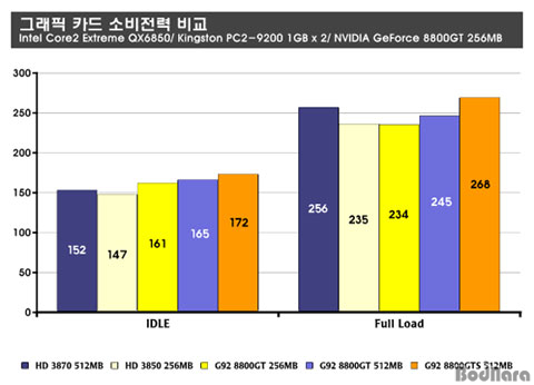 G92 8800GT 256MB´Â ÄÚ¾î¿Í ¸Þ¸ð¸® Ŭ·°ÀÌ 512MB ¹öÀü°ú ºñ±³ÇÏ¿© ³·¾ÆÁö°í ÀÖÀ¸¹Ç·Î Àüü ¼ÒºñÀü·ÂÀÌ ³·¾ÆÁú ¼ö ÀÖÀ» °ÍÀ¸·Î ¿¹»óµÇ¾ú´Âµ¥ ½ÇÁ¦ Å×½ºÆ® °á°ú Full Load¿¡¼­ G92 8800GT 512MBº¸´Ù 11W ³·Àº ¼ÒºñÀü·ÂÀ» º¸¿´°í HD 3850 256MB¿Í °ÅÀÇ ºñ½ÁÇÑ ¼öÁØÀ¸·Î ÃøÁ¤µÇ¾ú´Ù.
