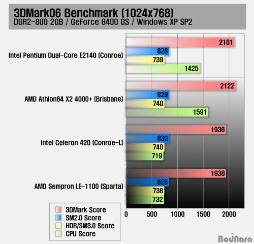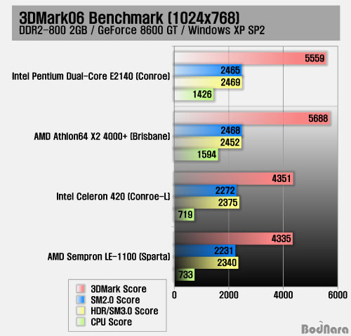 3DMark06Àº ¿©ÀüÈ÷ CPUÀÇ ¿µÇâÀÌ Å©Áö ¸øÇϱ⠶§¹®¿¡ ±×·¡ÇÈ ºÎ¹®ÀÇ °á°ú´Â µà¾ó ÄÚ¾î ¹× ½Ì±Û ÄھÀÇ ¾à°£ÀÇ Â÷ÀÌ´Â ÀÖÁö¸¸ ºñ½ÁÇÏ°Ô ³ª¿Ô°í, CPU Á¡¼ö¿¡ µû¶ó Á¾ÇÕ Á¡¼öµµ ¾à°£ÀÇ Â÷À̸¸ º¸¿´À» »Ó ÀÎÅÚ°ú AMD Ç÷§ÆûÀÇ Â÷ÀÌ´Â º¸¿©ÁöÁö ¾Ê¾Ò´Ù.