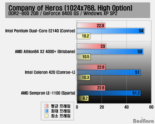 Company of Heros ÇÁ·¹ÀÓ Å×½ºÆ® °á°úµµ Quake4¿Í ¸¶Âù°¡Áö·Î °¢ CPUµéÀÇ ¼º´É Â÷À̸¦ º¸¿©ÁÖÁö ¸øÇÏ°í ¸»¾Ò´Ù. ¹°·Ð ÃÖ´ë ÇÁ·¹ÀÓÀº µà¾ó ÄÚ¾î CPUµéÀÌ ½Ì±Û Äھ ºñÇØ Á¶±Ý¾¿ÀÌ¶óµµ ´õ ³ô°í, ÃÖÀú ÇÁ·¹ÀÓÀº ¼ÀÇÁ·Ð LE-1100ÀÌ Quake4 1024x768 ÇØ»óµµ Å×½ºÆ®Ã³·³ È¥ÀÚ¸¸ ¾à°£ ¶³¾îÁö´Â °á°ú¸¦ º¸¿©ÁÖ¾úÁö¸¸ Æò±Õ ÇÁ·¹ÀÓÀº ¿ÀÂ÷ ¹üÀ§ ¼öÁØÀ̾ú´Ù.