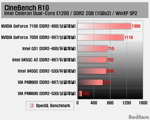 CineBench R10ÀÇ OpenGL Å×½ºÆ® °á°ú´Â OpenGL 2.1À» Áö¿øÇÏ¸ç µ¿ÀÛ Å¬·°À̳ª ³»Àå ±×·¡ÇÈ ½ºÆå¿¡¼­ °¡Àå ¶Ù¾î³­ ÁöÆ÷½º 7100°ú 7050ÀÌ ¼±µÎ¿¡ ¿Ã¶ú°í, OpenGL 1.4¸¦ Áö¿øÇÏ´Â ÀÎÅÚ G31°ú 945GC´Â ±×´ÙÁö Å« Â÷À̰¡ ³ªÁö ¾Ê¾Ò´Ù. ¿ª½Ã OpenGL 1.4¸¦ Áö¿øÇÏ´Â ºñ¾Æ P4M900Àº ÀÎÅÚ Ä¨¼Â¿¡ ¾à°£ ¸ðÀÚ¶õ Á¤µµ¿´Áö¸¸ OpenGL 1.2¸¦ Áö¿øÇÏ´Â P4M890ÀÇ °æ¿ì 100Á¡´ëÀÇ °¡Àå ³·Àº Á¡¼ö¸¦ ±â·ÏÇß´Ù.