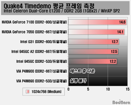 Quake4 °ÔÀÓ¿¡¼­ 1024x768 ÇØ»óµµ¿¡ Medium ¿É¼ÇÀ¸·Î ¼³Á¤Çϰí ŸÀÓ µ¥¸ð¸¦ µ¹·Á Æò±Õ ÇÁ·¹ÀÓÀ» ÃøÁ¤ÇÑ °á°ú ÁöÆ÷½º 7000 ½Ã¸®Áî´Â 14 ÇÁ·¹ÀÓ´ë, ÀÎÅÚ G31°ú 945GC´Â 12 ÇÁ·¹ÀÓ´ë·Î ¾çÂÊ ¸ðµÎ °ÔÀÓÀ» Áñ±â±â¿¡´Â ºÎÀûÀýÇÑ °á°ú¸¦ º¸¿´´Ù. ºñ¾Æ Ĩ¼ÂÀÇ °æ¿ì P4M890Àº 3DMark06°ú ¸¶Âù°¡Áö·Î ¾Æ¿¹ ½ÇÇà ºÒ°¡¿´°í P4M900Àº °ÔÀÓ ½ÇÇàÀº °¡´ÉÇßÀ¸³ª 1~3 ÇÁ·¹ÀÓ Á¤µµÀÇ È­¸éÀ¸·Î µ¥¸ð¸¦ µ¹¸®´Ù°¡ ´Ù¿îµÇ¾î ¹ö¸®´Â Çö»óÀÌ ÀÖ¾î Å×½ºÆ®¸¦ ¿Ï·áÇÏÁö ¸øÇß´Ù.