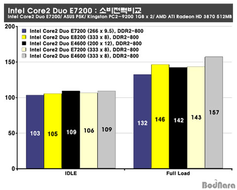 ¼ÒºñÀü·Â Å×½ºÆ®´Â CPU Çϳª¸¸ÀÇ ¼ÒºñÀü·ÂÀÌ ¾Æ´Ñ ½Ã½ºÅÛÀ» ±¸¼ºÇÑ Àüü ºÎǰµéÀÇ ¼ÒºñÀü·Â±îÁö Æ÷ÇÔÇϰí ÀÖ´Â °á°úÀ̸ç, E7200ÀÇ °æ¿ì 65nm °øÁ¤ Á¦Ç°µé°ú °°Àº 65W TDP¸¦ °¡Áö³ª 45nm °øÁ¤À» Àû¿ëÇÔ¿¡ µû¶ó ÀÌÀüÀÇ E4000 ½Ã¸®Áîµé°ú ºñ½ÁÇÑ Å¬·°¿¡¼­ ¼ÒºñÀü·ÂÀ̳ª ¹ß¿­ÀÌ ÁÙ¾îµé °ÍÀ¸·Î ¿¹»óµÈ´Ù.