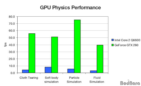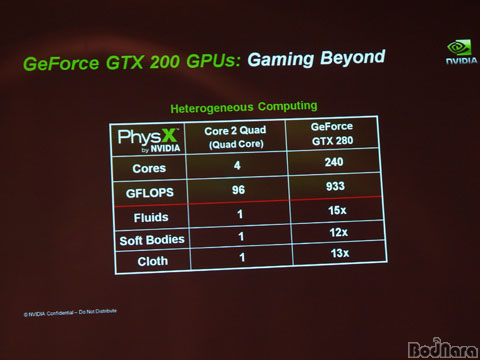 NVIDIA GeForce GTX 280/ 260 ½Ã¸®Áî´Â GeForce PhysX¸¦ ÅëÇØ GPU¸¦ ÀÌ¿ëÇÑ ¹°¸®¿¬»ê °¡¼ÓÀÌ °¡´ÉÇϸç, À̸¦ ÀÌ¿ëÇÑ ¹°¸®¿¬»ê °¡¼Ó µ¥¸ð¸¦ ½Ã¿¬À» ÁøÇàÇß´Ù.