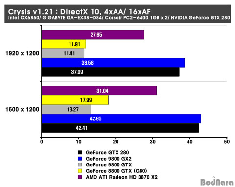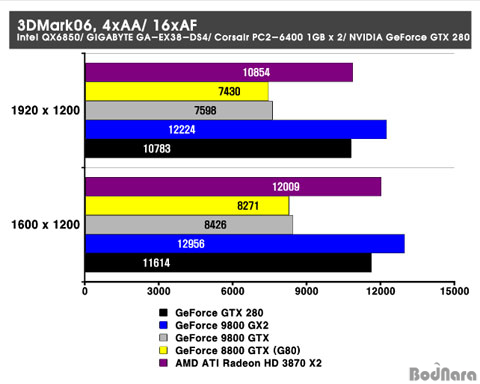 280ÀÌ µà¾ó GPUÀÎ 9800 GX2¸¦ ³Ñ¾î¼´Â ¼º´ÉÀ» º¸¿©ÁÖ°í ÀÖ´Ù. ƯÈ÷, DirectX 10 ȯ°æ¿¡¼´Â 9