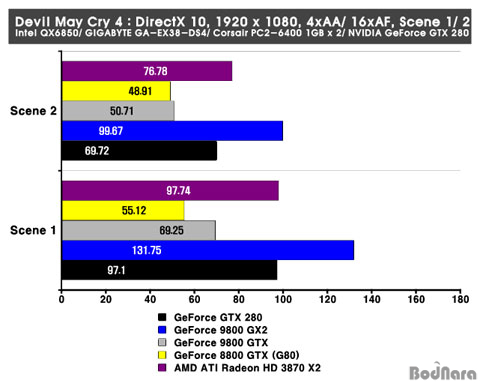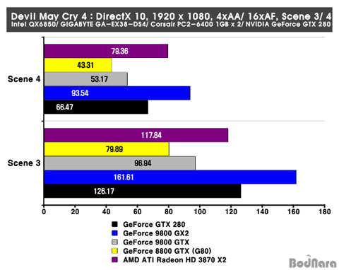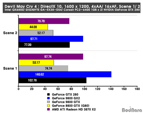 Scene¿¡¼´Â GeForce GTX 280ÀÌ ¾Õ¼¹À¸³ª ±× Â÷ÀÌ´Â ³ôÁö ¾ÊÀº °ÍÀ¸·Î ³ªÅ¸³µ´Ù. ¹Ý¸é, GeForce