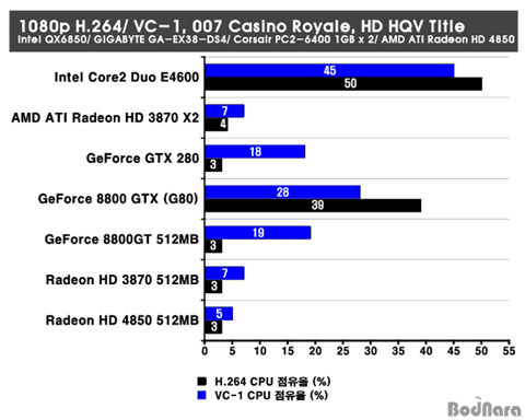 Å×½ºÆ® °á°ú CPU¸¸À¸·Î °¢ ŸÀÌÆ²À» °¡¼ÓÇÏ¿´À» ¶§ H.264´Â 50%, VC-1Àº 45%