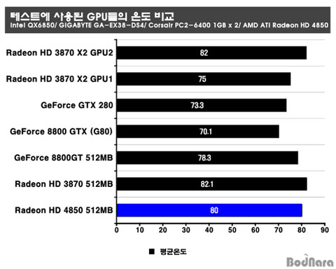 ÅëÇØ ÃøÁ¤µÈ Æò±Õ¿Âµµ¸¦ »ç¿ëÇß´Ù. HD 4850Àº Everest ÃֽйöÀü¿¡¼ ¿Âµµ ÃøÁ¤ÀÌ µÇÁö ¾Ê¾Æ GPU-Z 0.2.4