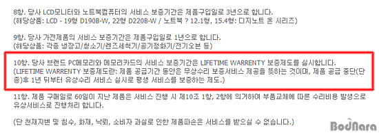 ¸Þ¸ð¸® ¾÷üµéÀº Áö±ÝÀÌ¶óµµ ÀÌ·± »óȲÀ» ¹Ù·Î Àâ¾Æ¾ßÇÒ Çʿ伺ÀÌ ÀÖ´Ù. Lifetime Warranty¸¦ Æò»ý º¸Áõ ¼­ºñ½º¶ó°í ³»¼¼¿ì¸ç ¼ÒºñÀÚµéÀÌ ¿ÀÇØ¸¦ »çµµ·Ï ³» ¹ö·ÁµÎ´Â °ÍÀº ºÐ¸íÈ÷ ¹®Á¦°¡ ÀÖ´Â °ÍÀÌ ¸Â´Ù. ±×¸®°í ¸Þ¸ð¸® ¾÷ü ½º½º·Î°¡ ÀÌ·¯ÇÑ ºÎºÐÀº ÀνÄÇϰí ÀÖ´Ù¸é Lifetime Warranty¸¦ ' Á¦Ç°°ø±Þ±â°£ µ¿¾È (¹«»ó)¼ö¸® '³ª ' (Á¦ÇÑÀû) ¹Ý¿µ±¸ º¸Áõ ' °°Àº Á¤È®ÇÑ ÀǹÌÀÇ ¹®±¸·Î Ç¥ÇöÇØ¾ß ÇÑ´Ù.