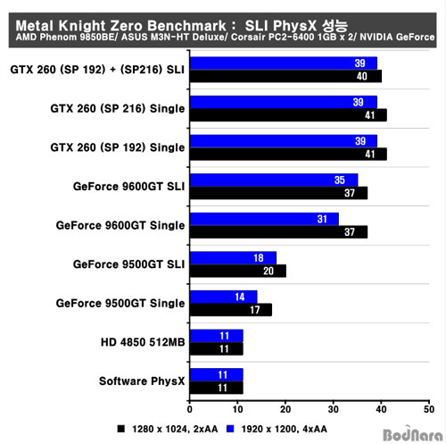 Å×½ºÆ® °á°ú SLI ±¸¼ºÀÇ ¼º´ÉÀº 10¸¸¿ø ÀÌÇÏÀÇ º¸±ÞÇü GeForce 9500GT 2°³¸¦ SLI ±¸¼ºÇϸé AA¸¦ Àû¿ëÇÏÁö ¾ÊÀ» °æ¿ì ¾î´À Á¤µµÀÇ Ç÷¹À̰¡ °¡´ÉÇÑ ¼öÁØÀÇ ÇÁ·¹ÀÓÀ» Á¦°øÇϰí ÀÖ´Â °ÍÀ» È®ÀÎÇÒ ¼ö ÀÖ´Ù. GeForce 9600GT ÀÌ»óÀÇ GPU·Î SLI¸¦ ±¸¼ºÇϸé AA¸¦ Àû¿ëÇÏ´õ¶óµµ °ÔÀÓÀ» ÁøÇàÇÒ ¼ö Àִ ÀÏÁ¤ ¼öÁØÀÇ ÇÁ·¹ÀÓÀ» Á¦°øÇÒ ¼ö ÀÖÀ» °ÍÀ¸·Î º¸¿©Áø´Ù. GTX 260 ÀÌ»ó°ú GTX 260 SLI ±¸¼ºÀÇ °æ¿ì ½Ì±Û GPU °¢°¢ÀÇ ±¸¼ºº¸´Ù ÇØ»óµµº°·Î Á¶±Ý ´õ ¶³¾îÁö´Â °á°ú¸¦ º¸¿©ÁÖ°í Àִµ¥ ÀÌ´Â CPU ¼º´É Á¦ÇÑÀ¸·Î ¾Õ¼­ÀÇ Metal Knight Zero º¥Ä¡¸¶Å©¿Í ºñ½ÁÇÑ ¾ç»óÀ» º¸¿©ÁÖ°í ÀÖ´Ù.