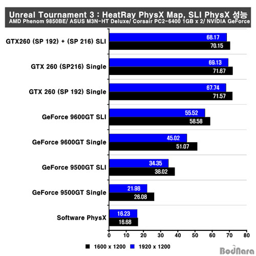 À̹ø Å×½ºÆ®´Â 10¸¸¿ø À̳»ÀÇ º¸±ÞÇü GeForce 9500GT, 10¸¸¿ø ÃʹÝÀÇ GeForce 9600GT, 30¸¸¿ø ´ëÀÇ GeForce GTX 260 (½ºÆ®¸² ÇÁ·Î¼¼¼­ 192°³¿Í 216°³¸¦ °¡Áø µÎ ±×·¡ÇÈ Ä«µå·Î SLI)±×·¡ÇÈ Ä«µå¸¦ °¢°¢ SLI ±¸¼ºÇÏ¿´À» ¶§ÀÇ ¼º´ÉÀ» ½Ì±Û GPU ±¸¼º°ú ºñ±³ÇÏ¿© PhysX ¹°¸®¿£Áø °¡¼Ó ¼º´ÉÀ» ºñ±³Çß´Ù.