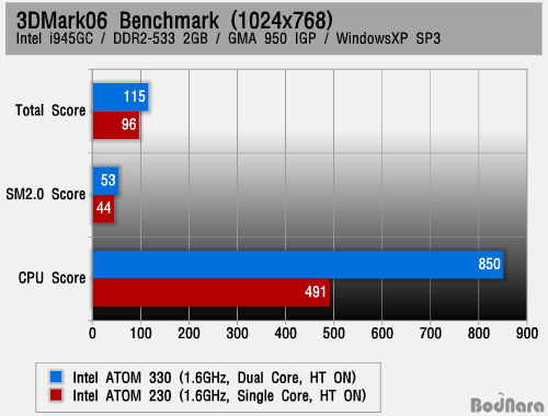 3DMark06 º¥Ä¡¸¶Å© Å×½ºÆ® °á°ú Shader Model 3.0À» Áö¿øÇÏÁö ¸øÇÏ´Â GMA 950 ±×·¡ÇÈ Äھ žÀçÇÑ ¾ÆÅè Ç÷§ÆûÀÇ Á¡¼ö´Â ±×¸® ³ôÁö ¾Ê¾Ò´Âµ¥, µà¾ó ÄÚ¾î ¾ÆÅè 330Àº CPU Á¡¼ö¿¡¼­ ½Ì±Û Äھ ºñÇØ 2¹è¿¡´Â ¹ÌÄ¡Áö ¸øÇßÁö¸¸ »ó´çÇÑ Â÷À̸¦ ±â·ÏÇßÀ¸¸ç, SM2.0 Å×½ºÆ®¿¡¼­ ±×¿¡ ÈûÀÔ¾î ±âÁ¸ ½Ì±Û ÄÚ¾î ¾ÆÅè Ç÷§Æûº¸´Ù Á»´õ ³ôÀº Á¡¼ö¸¦ ¾ò¾ú´Ù. ±×·¯³ª Àüü Á¡¼ö¸¦ º¸¸é µÎ Á¦Ç° ¸ðµÎ °í¼º´É 3D °ÔÀÓÀ» Áñ±æ ¼ö ÀÖ´Â ¼öÁØÀº ¾Æ´Ï´Ù.