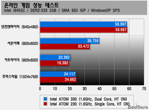 ´Ü, °ÔÀÓ ±×·¡ÇÈ ¿É¼Ç º¯°æÀÌ °¡´ÉÇÑ ¼­µç ¾îÅÃÀÇ °æ¿ì ±âº» ¿É¼Ç(800x600 ÇØ»óµµ)À¸·Î Ç÷¹ÀÌÇßÀ» ¶§ µà¾ó ÄÚ¾î ¾ÆÅè 330ÀÌ µé¾î°£ D945GCLF2¿¡¼­´Â ¾à 40ÇÁ·¹ÀÓ, ½Ì±Û ÄÚ¾î ¾ÆÅè Ç÷§Æû¿¡¼­´Â ¾à 33 ÇÁ·¹ÀÓ Á¤µµ¸¦ º¸¿´´Ù. ÇÏÁö¸¸ ¼­µç ¾îÅÃÀº ´Ù¸¥ °ÔÀÓµé°ú ´Þ¸® È­¸é ÀüȯÀ̳ª ÀÌÆåÆ®°¡ ¸¹ÀÌ µé¾î°¡±â ¶§¹®¿¡ ÀÌ·± Â÷À̰¡ µà¾ó Äھ »ç¿ëÇ߱⠶§¹®À̶ó°í ´ÜÁ¤ÇÏ±ä ¾î·Æ´Ù.