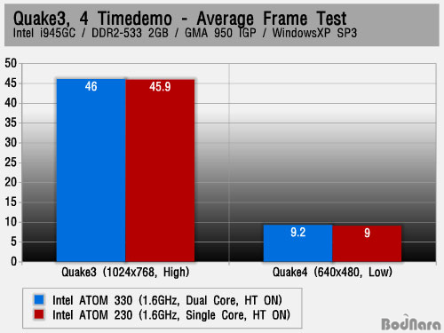 ƯÈ÷ Quake4ÀÇ °æ¿ì °ÔÀÓ¿¡¼­ ¸ÖƼ Äھ Áö¿øÇϱ⠶§¹®¿¡ µà¾ó ÄÚ¾î ¾ÆÅèÀ» »ç¿ëÇÑ D945GCLF2ÀÇ °á°ú°¡ ´õ ³ôÀ» °ÍÀ¸·Î ±â´ëÇßÁö¸¸, °ÅÀÇ °°Àº ÇÁ·¹ÀÓÀ» ±â·ÏÇß´Ù´Â °ÍÀº À̰ÍÀÌ CPUÀÇ ¹®Á¦°¡ ¾Æ´Ï¶ó i945GC¿¡ žÀçµÈ GMA 950 ³»Àå ±×·¡ÇÈÀÇ ÇѰè·Î ´õ ÀÌ»óÀÇ ÇÁ·¹ÀÓÀÌ ³ª¿ÀÁö ¸øÇÑ´Ù´Â °ÍÀ» Áõ¸íÇÑ´Ù.
