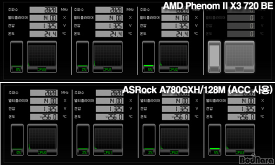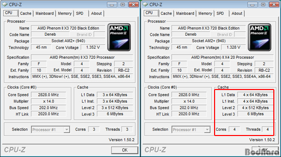 º¸µå¿¡¼­ ACC¸¦ »ç¿ëÇÏ¸é Æ÷½ºÆÃ È­¸éÀ̳ª ¹ÙÀÌ¿À½º¿¡¼­ AMD Æä³Ñ II X3¸¦ X4·Î ÀνÄÇϸç, CPU-Z¿¡¼­´Â ¿ø·¡ CPU À̸§ÀÌ Ç¥½ÃµÇÁö¸¸ ij½Ã¿Í ÄÚ¾î ¼ýÀÚ°¡ Äõµå Äھ ¸Â°Ô º¯È­µÈ °ÍÀ» È®ÀÎÇÒ ¼ö ÀÖ´Ù.