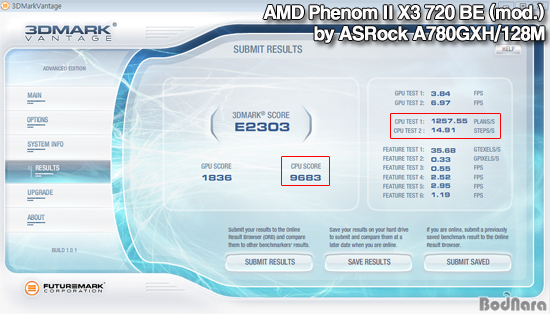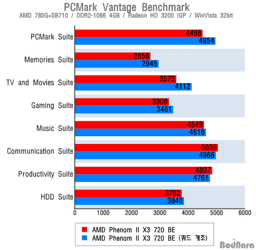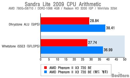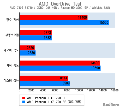 AMD ¿À¹öµå¶óÀ̺ê À¯Æ¿¸®Æ¼¿¡¼­µµ ½Ã½ºÅÛ ¼º´ÉÀ» ÃøÁ¤ÇÒ ¼ö ÀÖ´Â ±â´ÉÀ» Á¦°øÇϴµ¥, Æä³Ñ II X3 720 BE ±âº» »óÅÂÀÏ ¶§¿Í Äõµå ÄÚ¾î·Î º¯°æÇßÀ» ¶§ Á¤¼ö °è»ê ºÎ¹®¿¡¼­ ¼º´ÉÀÌ Å©°Ô ¿Ã¶ó°£ °ÍÀ» È®ÀÎÇÒ ¼ö ÀÖ´Ù.