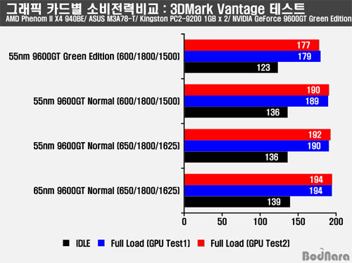 3DMark Vantage Å×½ºÆ® Áß ÃøÁ¤µÈ ¼ÒºñÀü·ÂÀº IDLE¿¡¼ 13/ 16W, Full Load´Â GPU Å×½ºÆ®1°ú Å×½ºÆ®2´Â 15/ 11W (55nm 9600GT), 17/ 15W (65nm 9600GT)ÀÇ Â÷À̸¦ º¸¿©ÁØ´Ù. 65nm¿Í 55nm 9600GT ÀÏ¹Ý ¹öÀü °£¿¡´Â IDLE 3W, Full Load 2/ 4W Á¤µµÀÇ Â÷À̸¦ º¸¿©ÁÖ°í Àִµ¥ À̴ Ŭ·°Àº ±×¸°¿¡µð¼Ç¿¡ ¸ÂÃß¾îÁ³Áö¸¸, Àû¿ëµÈ Àü¾ÐÀº ±×´ë·Î À¯ÁöµÇ°í ÀÖ¾î °øÁ¤ °³¼±¿¡ µû¸¥ ½ÇÁ¦ ¼ÒºñÀü·Â Â÷À̰¡ Å©°Ô ³ªÅ¸³ªÁö´Â ¾Ê¾Ò´Ù.