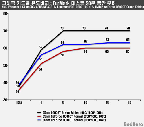 ¿Âµµ Å×½ºÆ® °á°ú´Â ¼·Î ´Ù¸¥ Äð·¯°¡ »ç¿ëµÇ´Â ¸¸Å GPUµé »çÀÌ¿¡ Â÷À̸¦ º¸¿´À¸¸ç, 55nm GeForce 9600GT ±×¸°¿¡µð¼ÇÀÇ °æ¿ì 65/ 55nm GeForce 9600GT ÀÏ¹Ý ¹öÀüÀÇ 75mm Å©±âÀÇ Ä𸵠ÆÒº¸´Ù ÀÛÀº 45mm Å©±âÀÇ Ä𸵠ÆÒÀÌ ÀåÂøµÇ°í ¹æ¿Çɵµ ¸éÀû¿¡ Â÷À̰¡ ÀÖ¾î °¡Àå ³ôÀº ¿Âµµ¸¦ ±â·ÏÇß´Ù. 65nm GeForce 9600GT ÀÏ¹Ý ¹öÀüÀº 55nm ÀÏ¹Ý ¹öÀü¿¡ »ç¿ëµÈ Ä𸵠¼Ö·ç¼Çº¸´Ù ¿ÀÈ÷·Á ´õ ³·Àº ¿Âµµ¸¦ ±â·ÏÇÏ¿© Ä𸵠ȿÀ²ÀÌ Á¶±Ý ´õ ³ªÀº °ÍÀ¸·Î ³ªÅ¸³µ´Ù.