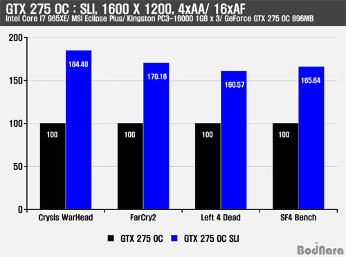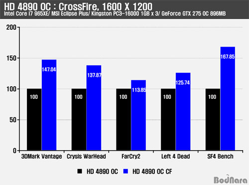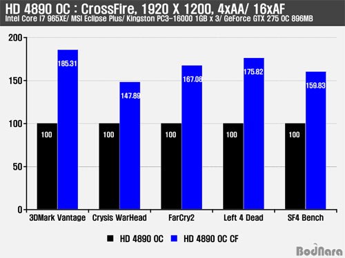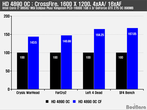 1600 x 1200 ÇØ»óµµ¿¡ 4xAA/ 16xAF¸¦ Àû¿ëÇÑ °á°ú¿¡¼´Â Left 4 Dead¿Í Street Fighter 4 º¥Ä¡¸¶Å©¿¡¼ HD 4890 OC CF ±¸¼ºÀÌ GTX 275 OC SLIº¸´Ù Çâ»óµÈ ¸ð½ÀÀ» º¸¿©ÁÖ¾ú°í ³ª¸ÓÁö Crysis WarHead¿Í FarCry2´Â ¿©ÀüÈ÷ GTX 275 OC SLI°¡ ´õ ³ôÀº Çâ»óÀ» º¸¿©ÁØ´Ù. 4°¡Áö °ÔÀÓÀÇ ¸ÖƼ GPU ·»´õ¸µ ±¸¼º½Ã Æò±Õ Çâ»ó ºñÀ²Àº GTX 275 OC SLI°¡ 170.21%, HD 4890 OC CF°¡ 155.45%·Î GTX 275 OC SLI°¡ ¾à 15% °¡·® ´õ ¾Õ¼¹´Ù.