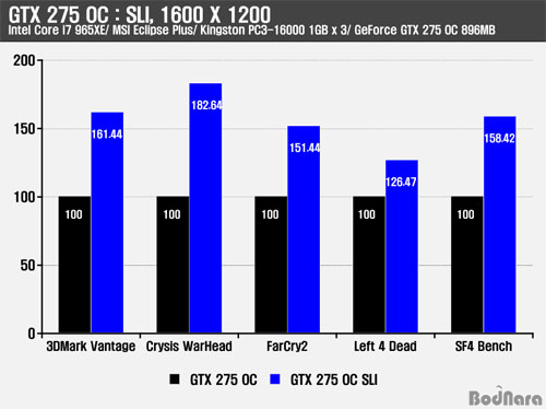 GTX 275 OC SLI¿Í HD 4890 OC CF ±¸¼º Áß 1600 x 1200 ÇØ»óµµ¿¡¼ÀÇ °á°ú¸¦ º¸¸é Àü¹ÝÀûÀÎ ¼º´É Çâ»ó ºñÀ²Àº GTX 275 OC SLI ±¸¼ºÀÌ HD 4890 OC CF ±¸¼ºÀ» ¾ÕÁö¸£´Â ¸ð½ÀÀ» º¸¿©ÁÖ°í ÀÖ´Ù. 5°¡Áö °ÔÀÓÀÇ ¸ÖƼ GPU ·»´õ¸µ ±¸¼º½Ã Æò±Õ Çâ»ó ºñÀ²Àº GTX 275 OC SLI°¡ 156.08%, HD 4890 OC CF°¡ 138.47%·Î GTX 275 OC SLI°¡ ¾à 20% °¡·® ´õ ¾Õ¼¹´Ù.
