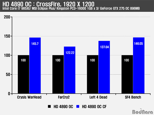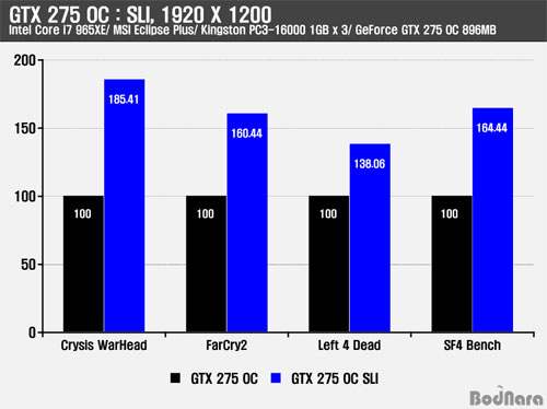 1920 x 1200 ÇØ»óµµ¿¡ 4xAA/ 16xAF Àû¿ë½Ã °á°ú¸¦ º¸¸é Àü¹ÝÀûÀÎ ¼º´É Çâ»ó ºñÀ²Àº GTX 275 OC SLI ±¸¼ºÀÌ HD 4890 OC CF ±¸¼ºÀ» ¾ÕÁö¸£´Â ¸ð½ÀÀ» º¸¿©ÁÖ°í ÀÖÀ¸³ª Left 4 Dead´Â ¿©ÀüÈ÷ HD 4890 OC CF ±¸¼ºÀÌ À¯¸®Çß´Ù. 5°¡Áö °ÔÀÓÀÇ ¸ÖƼ GPU ·»´õ¸µ ±¸¼º½Ã Æò±Õ Çâ»ó ºñÀ²Àº GTX 275 OC SLI°¡ 178.25%, HD 4890 OC CF°¡ 167.19%·Î GTX 275 OC SLI°¡ ¾à 11% °¡·® ´õ ¾Õ¼¹´Ù.
