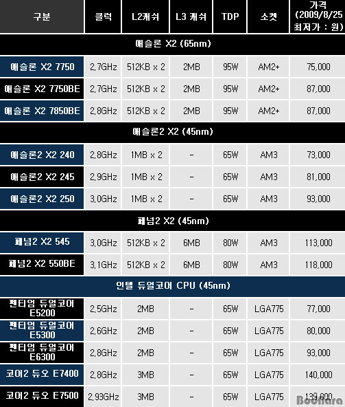 AMD¿Í ÀÎÅÚ º¸±ÞÇü µà¾óÄÚ¾î CPU´Â 10¸¸¿ø ÀÌÇÏ¿¡´Â ¾Ö½½·Ð2 X2 240/ 245/ 250, ÆæÆ¼¾ö µà¾óÄÚ¾î E5200/ E5300/ E6300ÀÇ Á¦Ç°µéÀ» ¼±ÅÃÇÒ ¼ö ÀÖÀ¸¸ç, 10¸¸¿ø Ãʹݿ¡´Â ÄÚ¾î2 µà¿À E7400/ E7500À» ¼±ÅÃÇÒ ¼ö ÀÖÀ¸¸ç, AMD´Â Æä³Ñ2 X2 545/ 550BE¸¦ 2Á¾À» ¼±ÅÃÇÒ ¼ö ÀÖ´Ù. ÀϺΠCPU¸¦ Á¦¿ÜÇϰí Àü¹ÝÀûÀ¸·Î ÀÎÅÚ º¸±ÞÇü CPUµéÀÌ Á¶±ÝÀº ´õ ³ôÀº °¡°Ý´ë¸¦ Çü¼ºÇϰí ÀÖ´Ù.