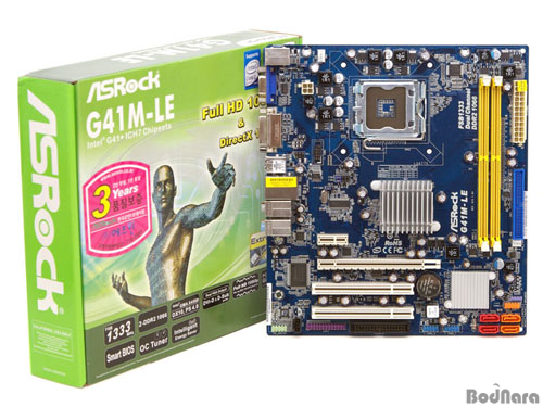 ÀÎÅÚ G41 Express Ĩ¼ÂÀ» »ç¿ëÇÑ ¸ÞÀκ¸µå »ùÇ÷δ ASRock¿¡¼­ Ãâ½ÃÇÑ G41M-LE¸¦ »ç¿ëÇß´Ù. G41 ¸ÞÀκ¸µå´Â »ç¿ì½ººê¸´Áö·Î G31°ú °°Àº ICH7ÀÌ µé¾î°¡ SATA Æ÷Æ®ÀÇ ¼ýÀÚ´Â 4°³¸¸ °¡Áö°í ÀÖ´Ù. GMA X4500 ³»Àå ±×·¡ÇÈ Ãâ·ÂÀ» À§ÇÑ D-SUB¿Í DVI Æ÷Æ®¸¦ Á¦°øÇϸç, Ç® HD 1080p Áö¿øÀ» Ç¥¹æÇÏÁö¸¸ G45ó·³ Ç® Çϵå¿þ¾î µðÄÚµù ±â´ÉÀ» °¡Áø °ÍÀº ¾Æ´Ï´Ù.