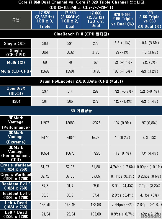 ÄÚ¾î i7 860À» 2.66GHz·Î ¼³Á¤ÇßÀ» ¶§ ÄÚ¾î i7 920°ú Æ®¸®ÇÃä³Î ´ë µà¾óä³Î ±¸¼ºÀÇ ¼º´ÉÀ» ºñ±³ÇÒ ¼ö Àִµ¥ ÄÚ¾î i7 920 (2.66GHz)À» ±âÁØÀ¸·Î ¼º´ÉÂ÷À̸¦ ±¸ÇÏ¿´´Ù. ¸°Çʵå ÄÚ¾î i7 860À» ºí·ëÇʵå ÄÚ¾î i7 920°ú °°Àº 2.66GHz¸¦ ¼³Á¤ÇÏ¿´À» ¶§ ÀϺΠ°ÔÀÓ¿¡¼ÀÇ 4% ³»¿ÜÀÇ ¼º´É Çâ»ó ¿Ü¿¡ ´ëºÎºÐÀÇ ¼º´ÉÀÌ ±Ù¼ÒÇÏ°Ô ¶³¾îÁö´Â ¸ð½ÀÀ» º¸¿©ÁÖ°í ÀÖ´Ù. ÀÌ´Â 3ä³Î DDR3 ¸Þ¸ð¸® ±¸¼ºÀ» ÅëÇØ ´õ ³ôÀº ´ë¿ªÆø È®º¸°¡ °¡´ÉÇÑ ºí·ëÇʵå ÄÚ¾î i7 920ÀÇ À¯¸®ÇÑ Á¡ÀÌ´Ù.