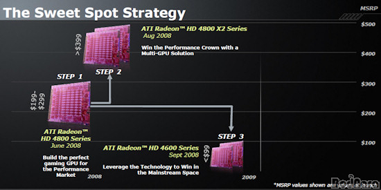 AMDÀÇ ¿ÜºÎ GPU Àü·«Àº '½ºÀ ½ºÆÌ(Sweet Spot)'À̶ó°í ºÒ¸°´Ù. ½ºÀ ½ºÆÌÀº °¡°Ý´ëºñ ¼º´Éºñ°¡ ³ôÀº CPU¸¦ ¸¸µé´ø AMDÀÇ ¼º°ÝÀÌ GPU »ç¾÷¿¡µµ Á¢¸ñµÈ °ÍÀ¸·Î º¸À̴µ¥, ¹«Á¶°Ç °í¼º´É GPU¸¦ ¸¸µå´Â °ÍÀÌ ¾Æ´Ï¶ó ÀÏÁ¤ °¡°Ý´ë·Î Ãâ½Ã °¡´ÉÇÑ ¼º´ÉÀ» °¡Áø GPU¸¦ ¸ÕÀú »ý»êÇÑ ÈÄ, À̸¦ ¹ÙÅÁÀ¸·Î °í¼º´É ½ÃÀå¿¡´Â µà¾ó GPU³ª ¸ÖƼ GPU·Î ¼º´ÉÀ» ³ôÀÌ°í ¸ÞÀνºÆ®¸² ¹× Àú¼º´É ½ÃÀå¿¡´Â °°Àº ¾ÆÅ°ÅØÃ³ ±â¹Ý¿¡ ¼º´ÉÀ» ³·Ãá Á¦Ç°À» Â÷·Ê·Î ÅõÀÔÇÑ´Ù´Â °ÍÀÌ´Ù.