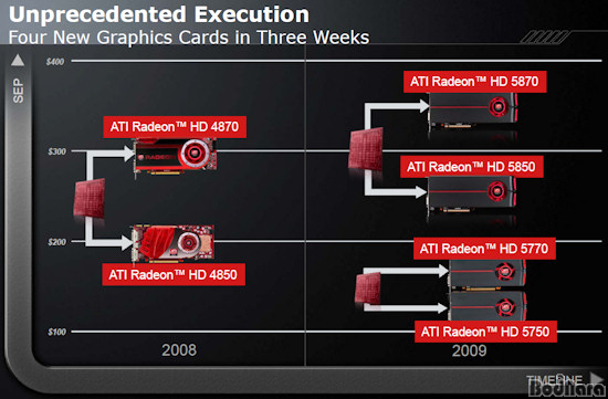 AMDÀÇ ½ºÀ ½ºÆÌ Àü·«Àº ¶óµ¥¿Â HD 4800 ½Ã¸®Áî¿¡ À̾î ÃֽŠ5000 ½Ã¸®Áî¿¡¼ ´õ¿í ±¸Ã¼ÀûÀÌ°í »¡¶óÁ³´Ù. ¶óµ¥¿Â HD 4870°ú 4850À¸·Î¸¸ ±¸ºÐÇß´ø Ãʱâ 4000 ½Ã¸®Áî ½ÃÀå°ú ´Þ¸® ¶óµ¥¿Â HD 5000 ½Ã¸®Áî´Â 5870, 5850, 5770, 5750 µî Ç÷¡±×½Ê-ÇÏÀÌ¿£µå ¸ðµ¨ 4°³ Á¦Ç°ÀÌ °ÅÀÇ ºñ½ÁÇÑ ½Ã±â¿¡ µîÀåÇÏ¸é¼ DX(DirectX)11 ½Ã´ëÀÇ ÁÖµµ±ÇÀ» AMD ÂÊÀ¸·Î ±â¿ï°Ô Çß´Ù.