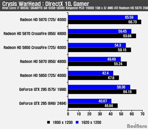 Crysis WarHead¿¡ 4xAA/ 16xAF¸¦ Àû¿ëÇÑ °á°ú´Â AA/ AF¸¦ Àû¿ëÇÏÁö ¾Ê¾Ò´ø °á°ú¿Í ¸¶Âù°¡Áö·Î HD 5970ÀÇ ÇÁ·¹ÀÓÀÌ °¡Àå ³ô¾Ò°í ÀÌ¾î¼ GeForce GTX 295µµ 1600¿¡¼´Â HD 5870 CFº¸´Ù ±Ù¼ÒÇÏ°Ô ³ôÀº ÇÁ·¹ÀÓÀ» Á¦°øÇÑ´Ù. ÀÌ¾î¼ HD 5850 CF, HD 5870 ¼øÀ¸·Î ³ªÅ¸³µ´Ù.