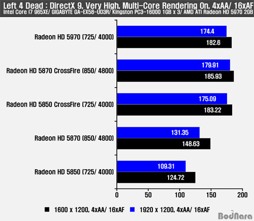 Left 4 Dead Å×½ºÆ®¿¡¼´Â ¾Õ¼ÀÇ AA/ AF ¹ÌÀû¿ë °á°úó·³ ÇÁ·¹ÀÓÀÇ Â÷À̰¡ Å©°Ô ³ªÅ¸³ªÁö´Â ¾Ê¾ÒÀ¸³ª Àü¹ÝÀûÀ¸·Î HD 5870 CF ±¸¼ºÀÌ °¡Àå ³ôÀº ÇÁ·¹ÀÓÀ» Á¦°øÇß°í HD 5850 CF, HD 5970 ¼øÀ¸·Î HD 5850 CF¿Í HD 5970Àº HD 5850 CF°¡ ±Ù¼ÒÇÏ°Ô ÇÁ·¹ÀÓÀÌ ¾Õ¼°í ÀÖ´Ù.