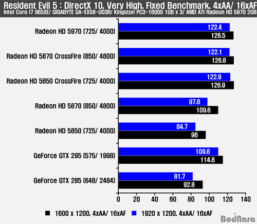 Resident Evil 5´Â HD 5970°ú HD 5870 CF, HD 5850 CF »çÀÌ¿¡ ÇØ»óµµº° ÇÁ·¹ÀÓ Â÷ÀÌ´Â Å©°Ô ³ªÅ¸³ªÁö ¾Ê¾ÒÀ¸¸ç, GeForce GTX 295´Â À̵麸´Ù ³·Àº ÇÁ·¹ÀÓÀ» Á¦°øÇß´Ù.