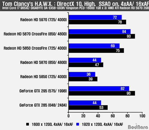 H.A.W.X. Å×½ºÆ®´Â Ŭ·°ÀÌ °¡Àå ³ô°Ô Àû¿ëµÇ¾î CrossFire°¡ ±¸¼ºµÈ HD 5870 CF ±¸¼ºÀÌ °¡Àå ³ôÀº ÇÁ·¹ÀÓÀ» Á¦°øÇß°í HD 5850 CFº¸´Ù HD 5970ÀÌ Á¶±Ý ´õ ³ôÀº ÇÁ·¹ÀÓÀ» Á¦°øÇϰí ÀÖ´Ù. À̹ø Å×½ºÆ®´Â GeForce GTX 295ÀÇ ¼º´ÉÀÌ HD 5870 CF¿¡ ±ÙÁ¢ÇÏ´Â ÇÁ·¹ÀÓÀ» Á¦°øÇØÁÖ°í ÀÖ´Ù.